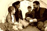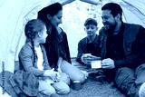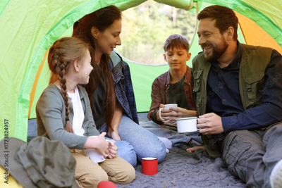 Happy family spending time together in camping tent with mugs of hot drink outdoors
