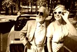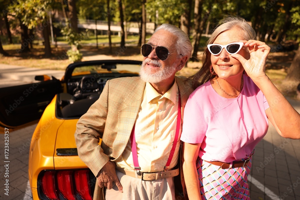 Stylish senior couple in sunglasses near modern cabriolet outdoors