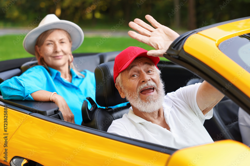 Senior couple enjoying cabriolet ride outdoors, selective focus