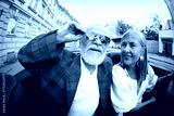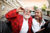 Senior couple enjoying cabriolet ride in city, wide angle lens