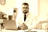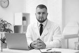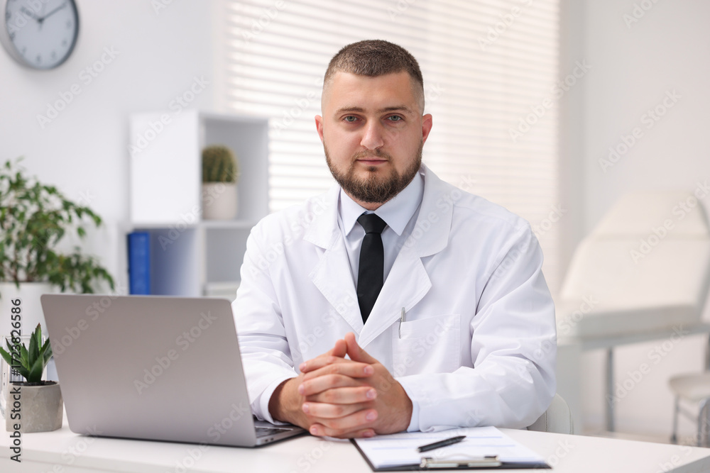 Doctor working at table with laptop in clinic. Online medical consultation