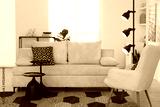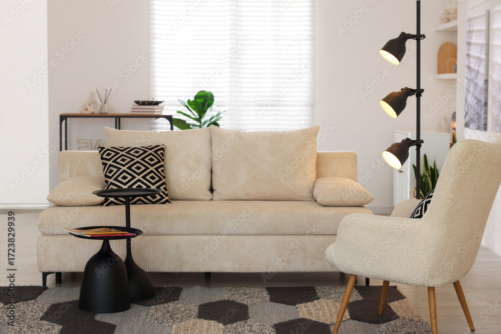 Stylish living room with lamp, houseplant and sofa. Interior design