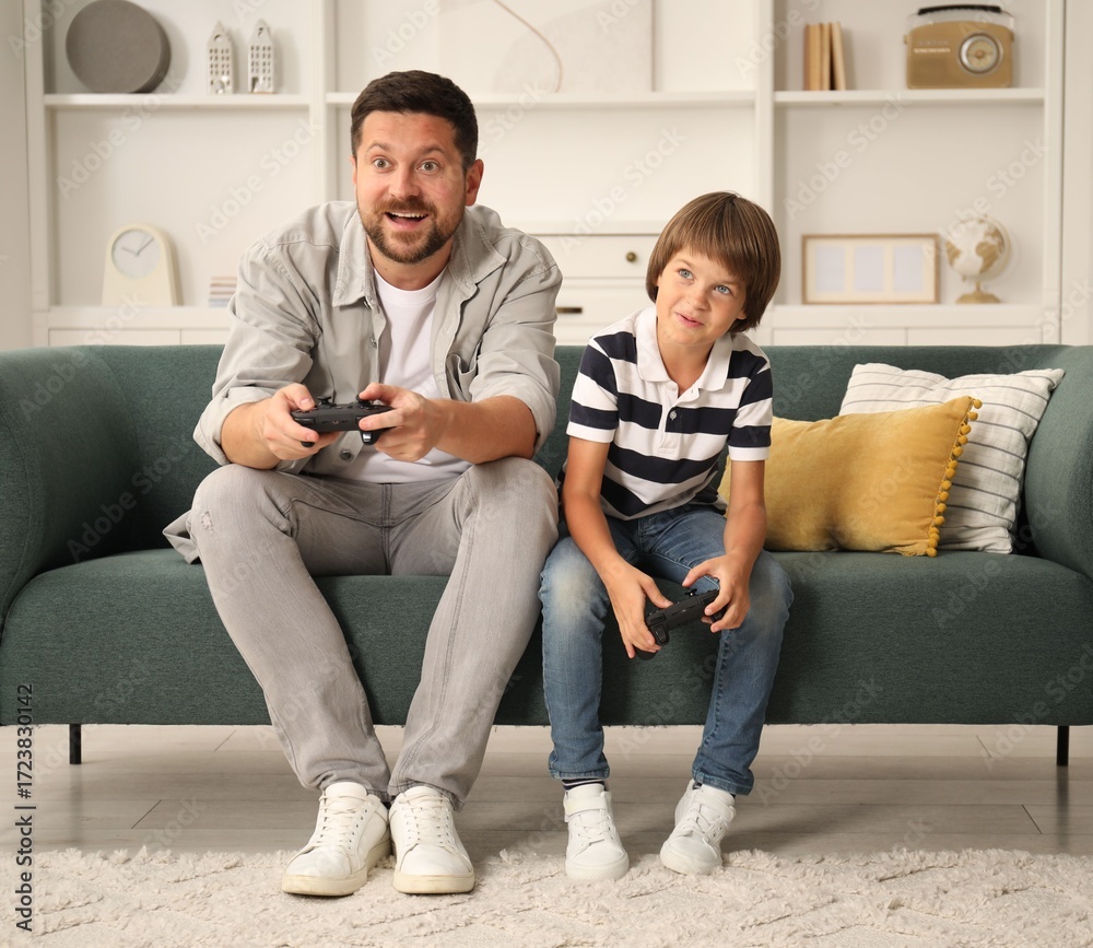 Father and son with controllers playing videogame on sofa at home