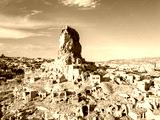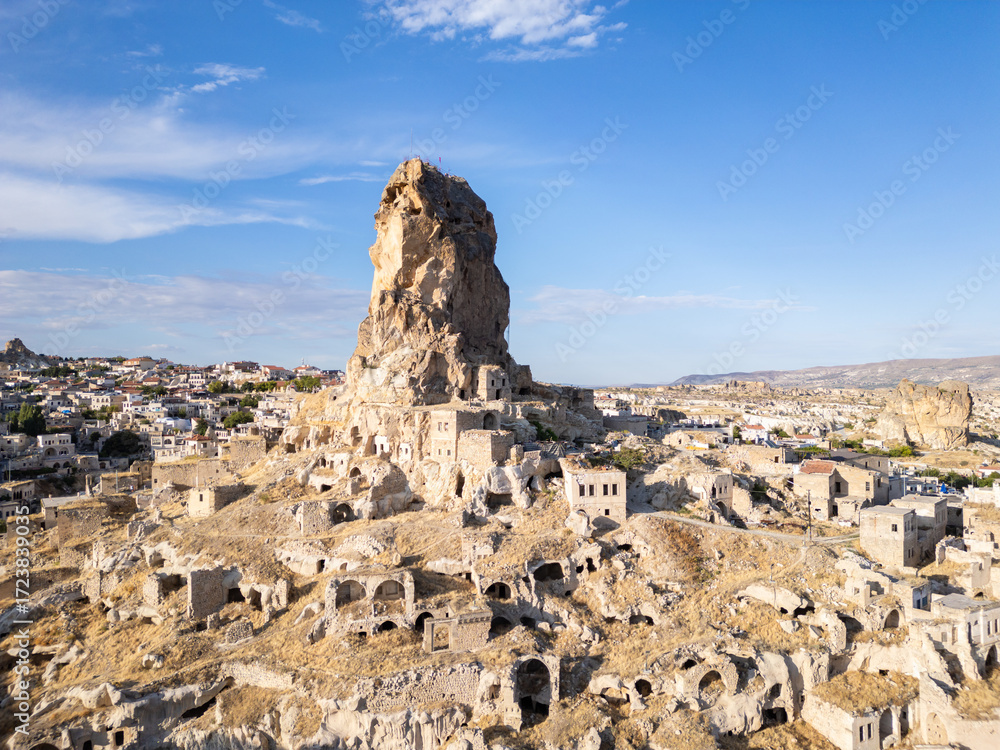 Ortahisar, Turkiye: Close up aerial view of the famous Ortahisar castle that overlooks the old town in the Cappadocia region of Anatolia in Turkey