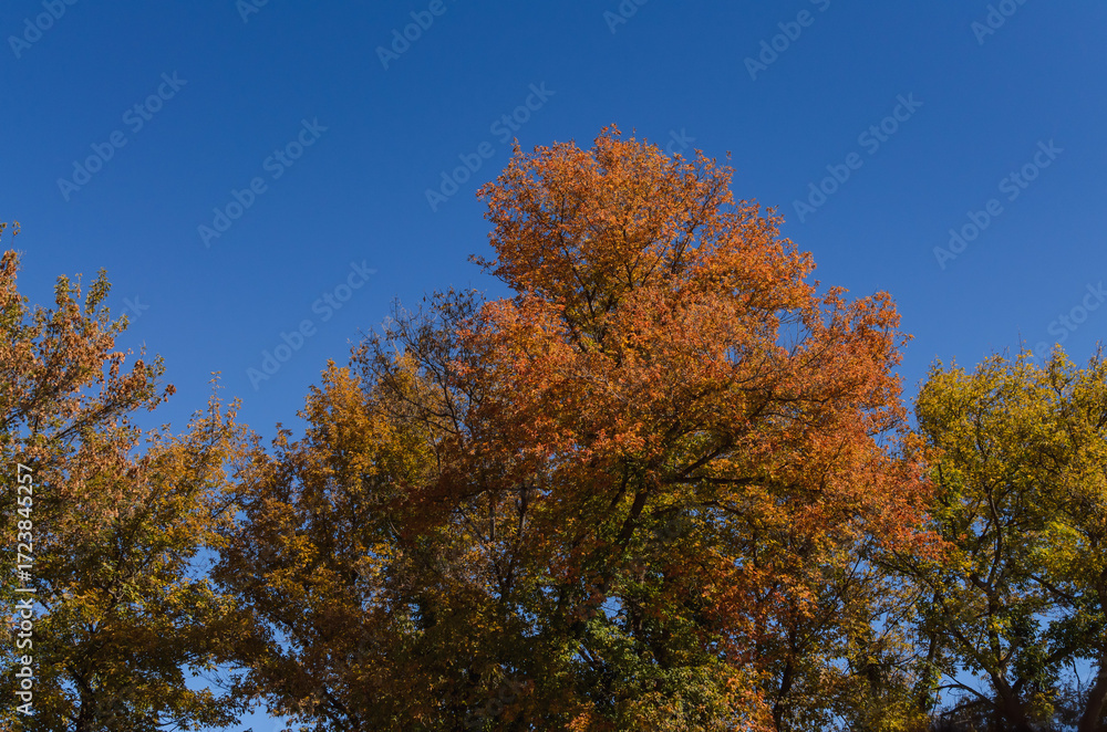 autumn trees with bright orange leaves in the sunlight against a clear blue sky