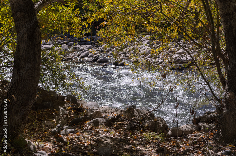 view of the flow of a mountain river and the yellow leaves of trees in the sunlight