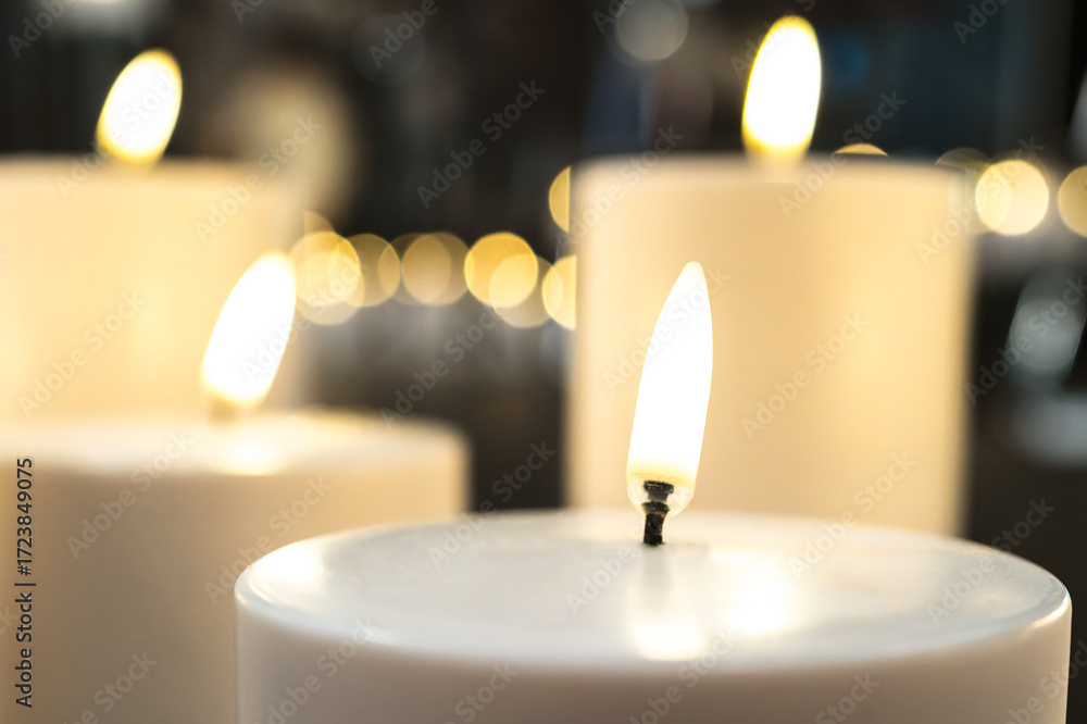 Shallow focus of a LED lit fake candle seen with out LED candles within a church setting. Safer than traditional wax candles.