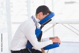 Man in business attire sitting on blue massage chair in wellness room leaning forward