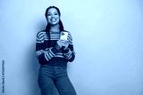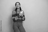 Confident young woman with braided hair holding smartphone against bright pink background, dressed in colorful striped sweater