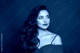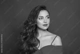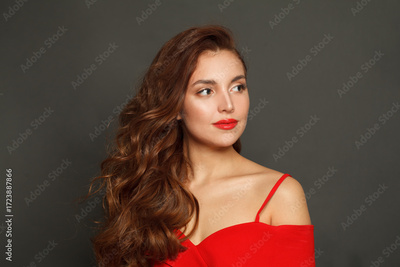 Fashion portrait of brunette woman with trendy make-up and brown curly hair wavy hairstyle and red lips makeup on black background