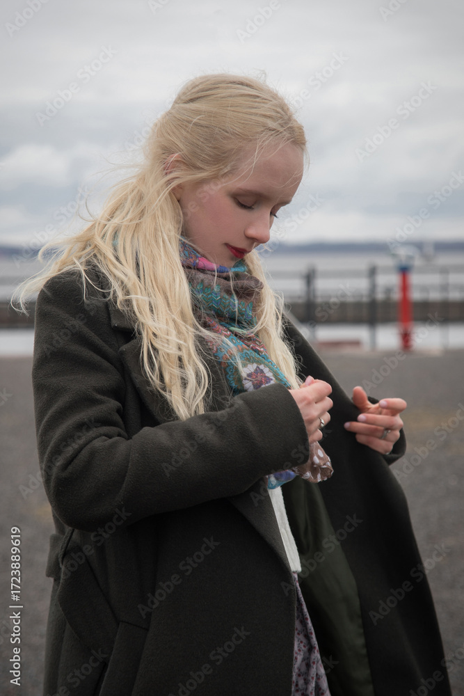 Pretty young woman with blond hair walking outdoors, portrait