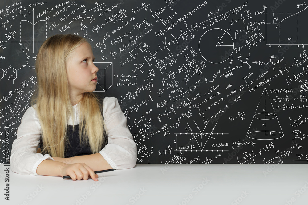 Angry child student sitting in classroom on chalkboard background with mathematical formulas
