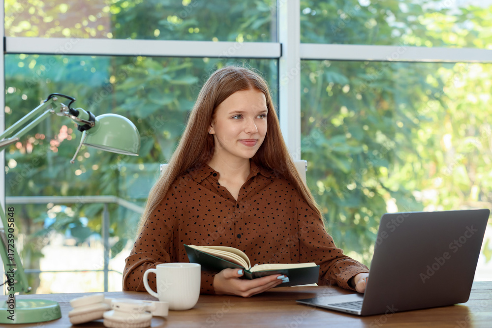 Teenage girl with book using laptop at wooden desk indoors. Home workplace