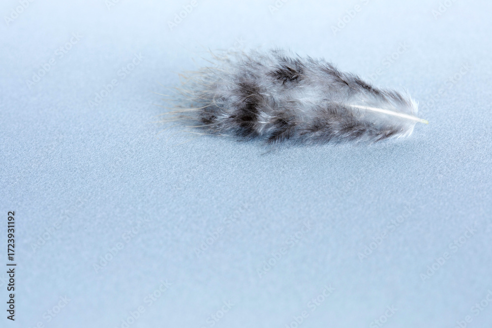Macro view fluffy bird feather, blue velvet paper background, copy space.