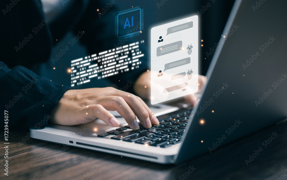 Hands typing on laptop with AI chatbot interface, representing artificial intelligence, natural language processing, customer support, and digital communication technology.
