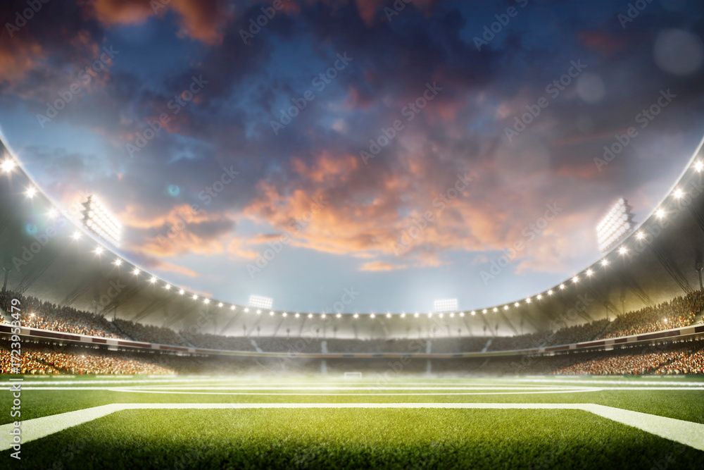 Soccer arena full of fans. Soccer championship. Professional soccer stadium. Sports concept. Sunset on stadium. Panorama