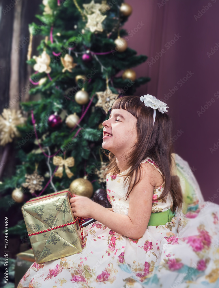 Laughing girl in white floral dress sitting on sofa enjoying opening Christmas tree presents. golden gift present box unpacking. Winter holiday family time. elegant classic style living room