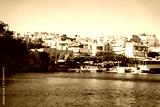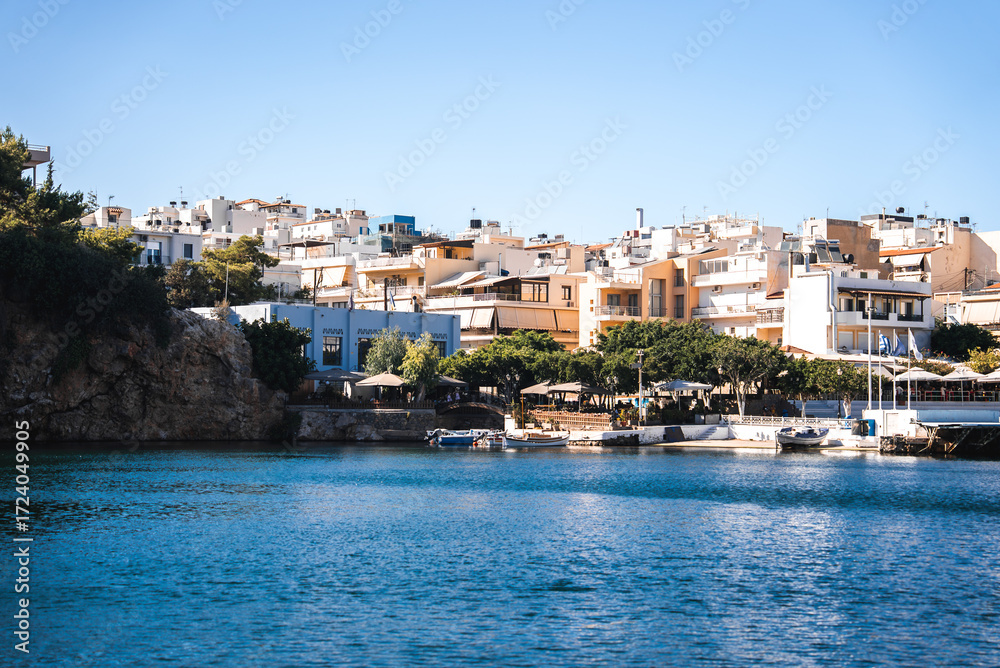 A Mediterranean town Agios Nikolaos on Crete, Greece, with white and pastel buildings by calm turquoise water. Boats dock near the shore, with greenery on a rocky outcrop.