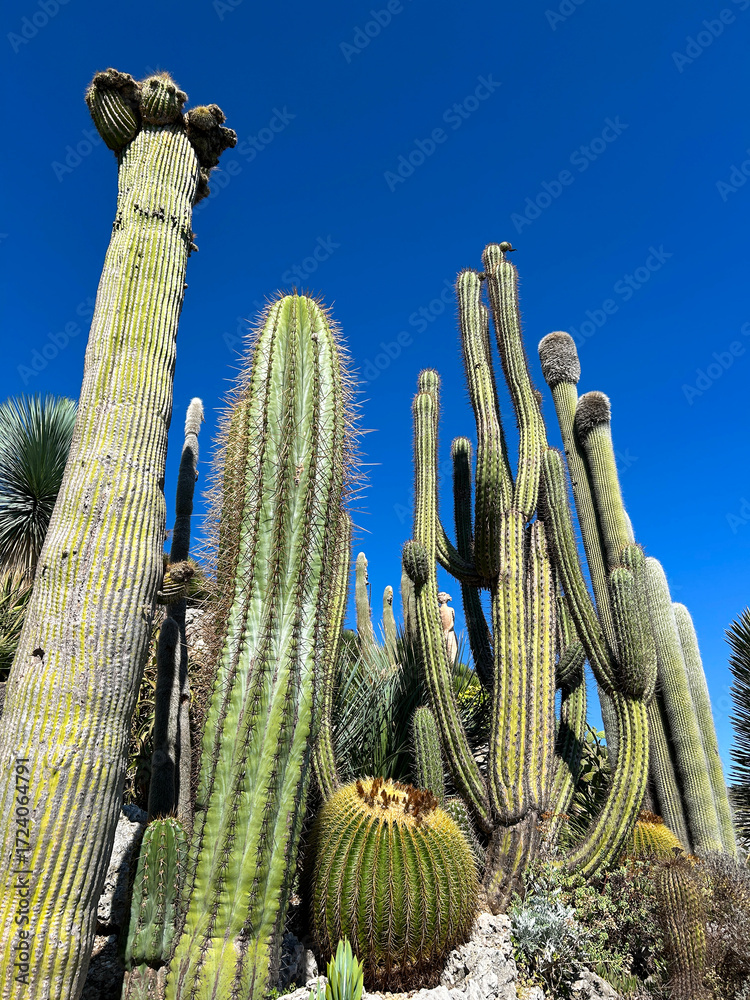 Cacti in the botanical garden on a summer day. Close-up. Eze. France.