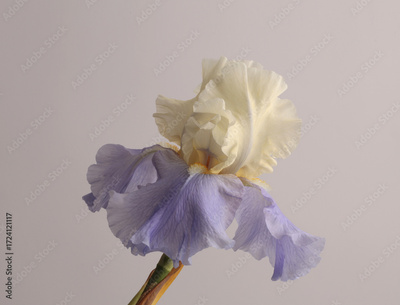 Close-up cream beige, lilac, violet Iris Flower bud on gray. Natural art background.