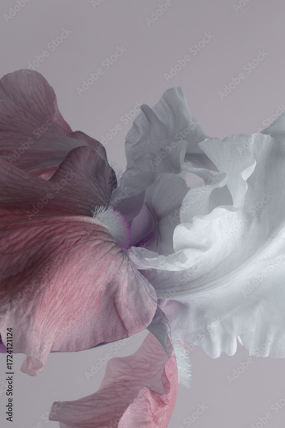 Macro Beige, lilac, violet,Iris Flower bud petal on gray neutral. Natural art background.