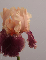Close-up cream beige, pink, mocha Iris Flower bud petals on gray. Natural macro art background.