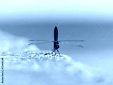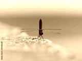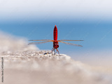Vibrant red dragonfly with transparent wings resting on textured stone against blue sky background