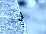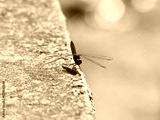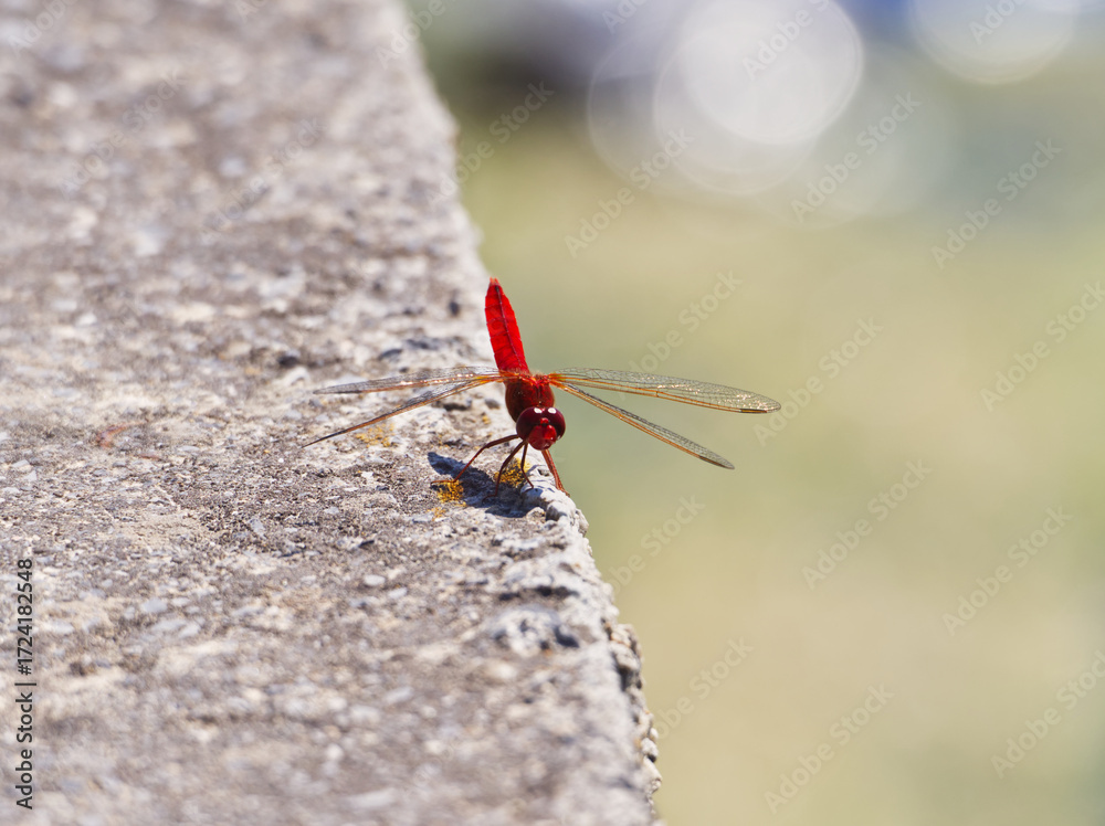 Close-up of red dragonfly with transparent wings perched on rough concrete surface with blurred background