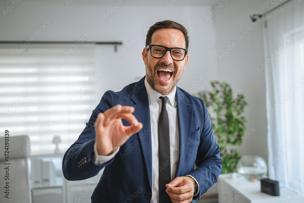 Smiling businessman making okay gesture holding smart phone in office