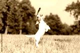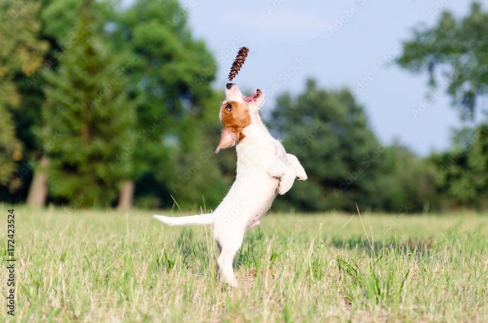 Szczeniak Jack Russell terrier bawi się na łące, skacze w gorę.