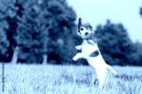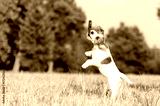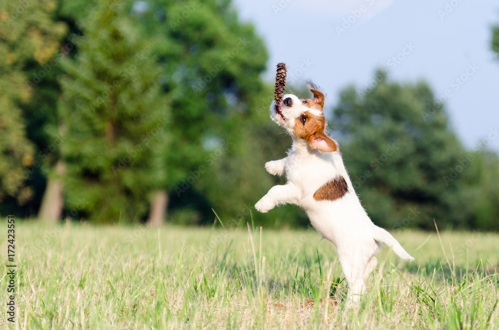 Szczeniak Jack Russell terrier bawi się na łące, skacze w gorę.