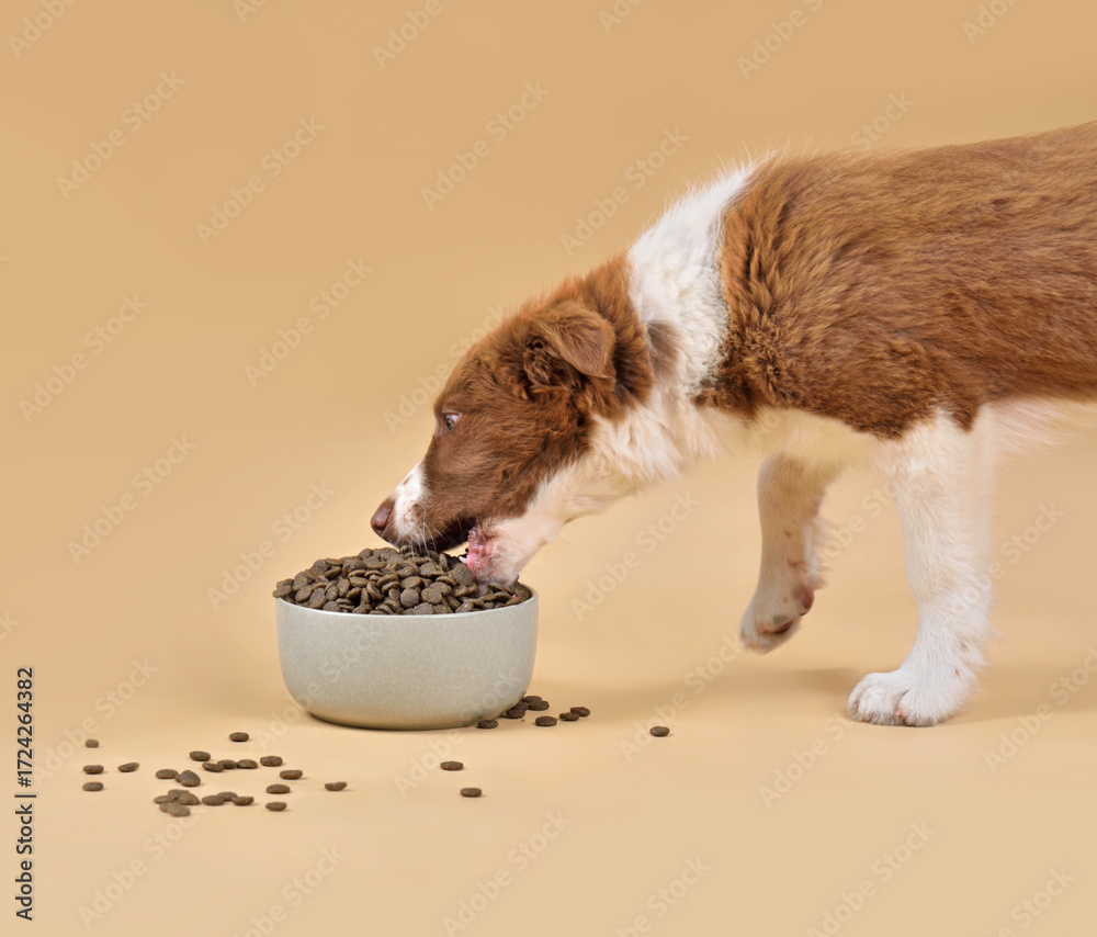 Funny puppy eating from ceramic bowl