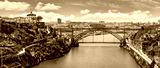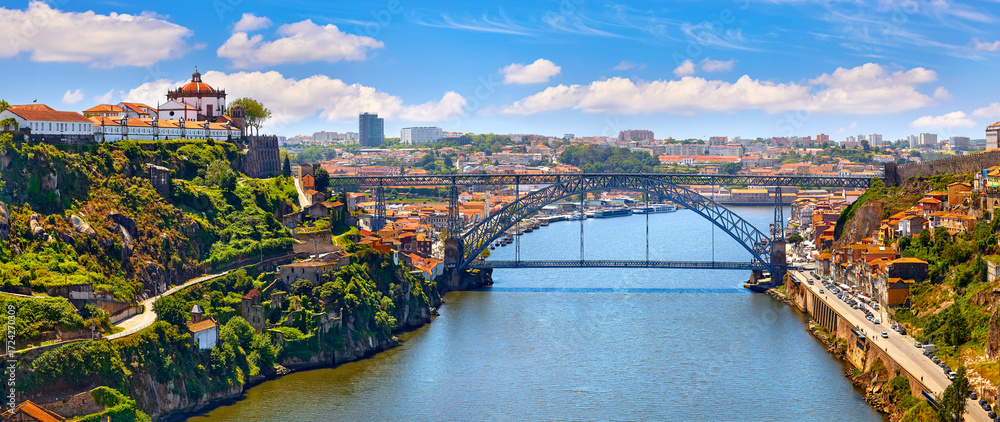 Porto, Portugal. Panoramic view at Ponte de Dom Luis bridge on river Douro. Building of monastery Mosteiro da Serra do Pilar on the knoll. Sunny day. Sky with clouds. European city.