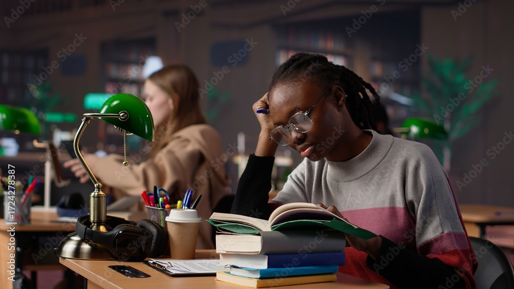 Exhausted student falling asleep while she reads for periodical exams at the college, working hard for diploma with excellent marks. Tired pupil studying all night before first grade. Camera A.