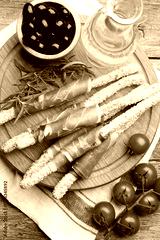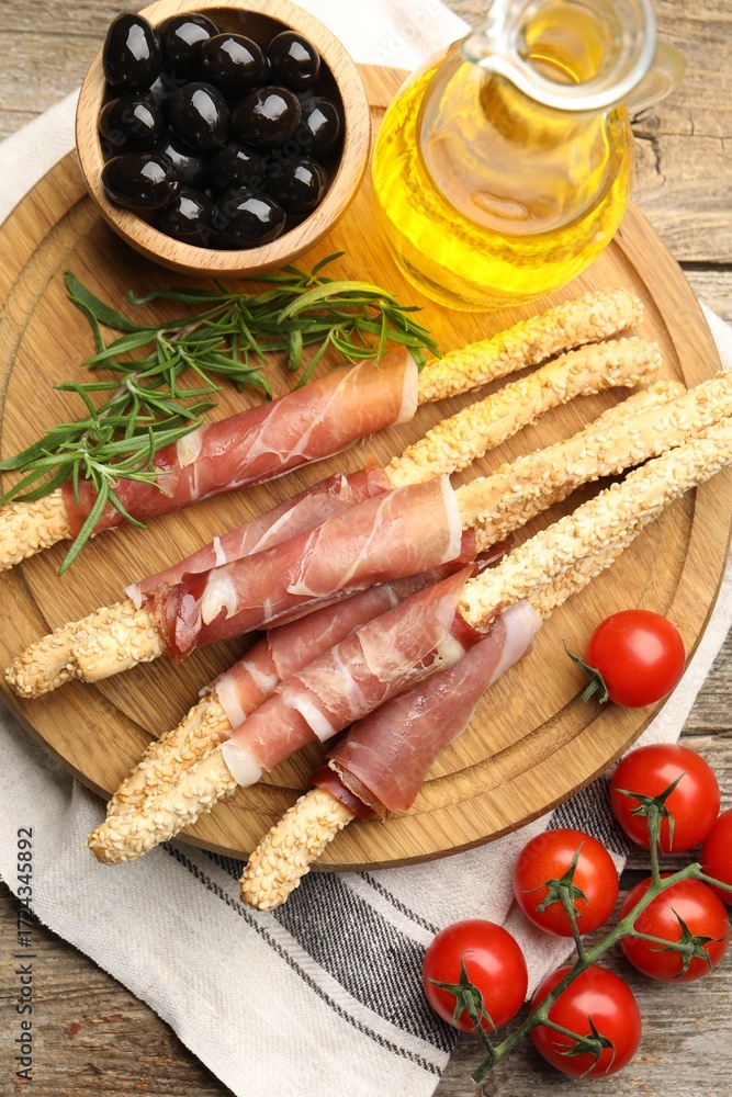 Delicious grissini sticks with sesame seeds, prosciutto and other products on wooden table, flat lay