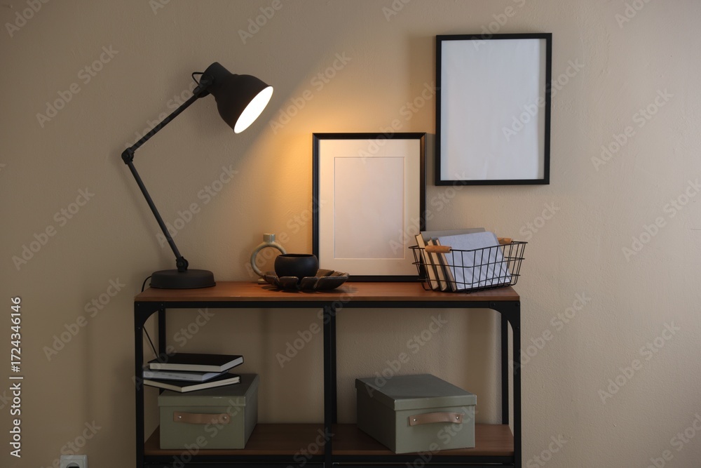 Stylish lamp, other decor and books on console table near beige wall indoors