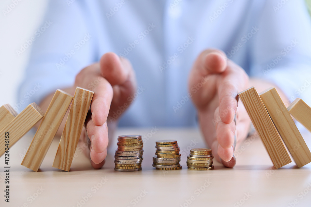 Risk. Man stopping domino effect to protect coins at table, closeup