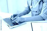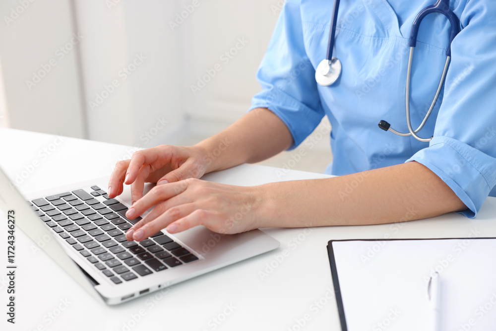 Nurse working with laptop at white table in clinic, closeup