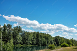 A beautiful landscape of the river surrounded by trees on a sunny summer day under blue sky.
