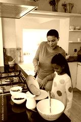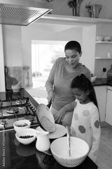 African American mom and daughter flipping pancake on island while watching mixing bowl and berries