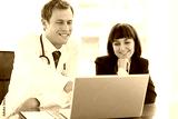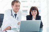 Diverse coworkers in medical coat examining laptop at glass desk at office with stethoscope and pen