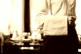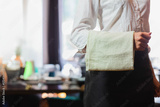 Waffle-weave cloth towel draping over black waist apron in restaurant dining area, with set tables