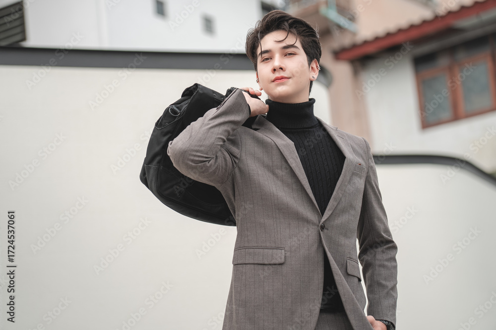 Confident Young Man in Stylish Suit Posing Outdoors with Bag