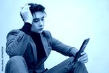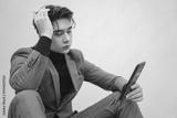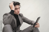 Young Man in Stylish Suit Reading on Smartphone with Thoughtful Expression