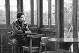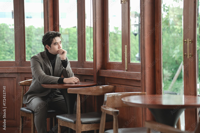 Thoughtful Young Man Sitting Alone in Cafe with Wooden Decor
