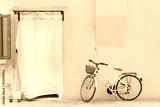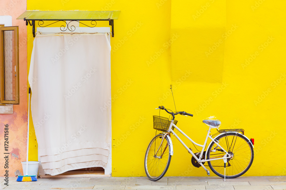 Beautiful yellow house with a bicycle. Colorful houses in Burano island near Venice, Italy.