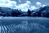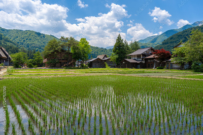 Traditional rice fields and gassho houses in Shirakawa-go village, Japan