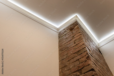 A contemporary interior featuring an exposed brick pillar in white room