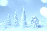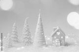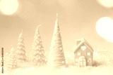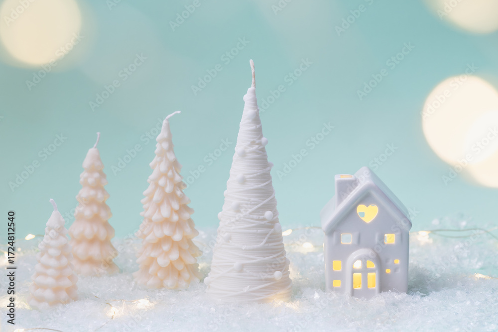 Christmas background, card. White handmade wax candles in the shape of fir trees and glowing lantern houses on a blurred background.