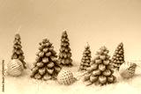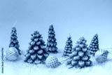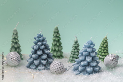 Christmas background, card. Handmade wax candles in the shape of fir trees and silver Christmas tree baubles on snow against a blue background.
